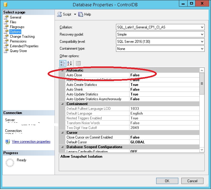 • Using SQL Server Studio, change the value of Auto Close to False.