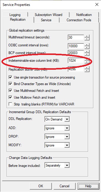 On the general panel of Service Properties, increase the Intedeterminate-size column limit from its default of 1024 (KB) to a larger number. This value is used to allocate the maximum buffer associated with LOB data for Apply. The optimal value is dependent on the size of the data in your LOB columns.