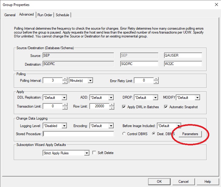 - Select the Parameters button and enter the following information, which instructs SQDR Plus (tier 2) how to apply change data: