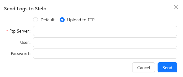 - A dialogue will appear asking if logs should be sent to Stelo (default) or to a different FTP location. Select Default and then Send to send the logs to the Stelo Support Team.