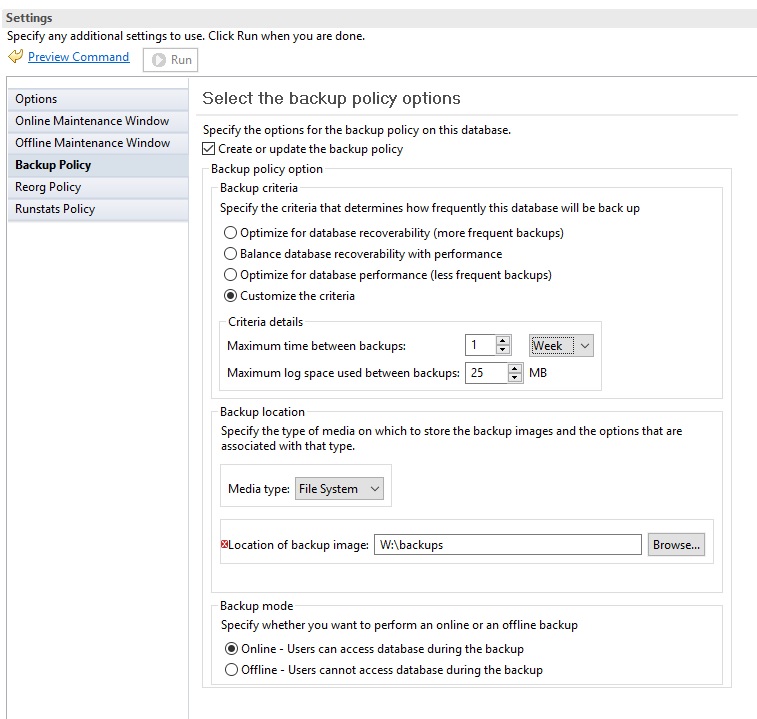 CALL SYSPROC.AUTOMAINT_SET_POLICY ( 'AUTO_BACKUP', BLOB('<?xml version="1.0" encoding="UTF-8"?><DB2AutoBackupPolicy xmlns="http://www.ibm.com/xmlns/prod/db2/autonomic/config"><BackupOptions mode="Online"><BackupTarget><DiskBackupTarget><PathName>W:\backups</PathName></DiskBackupTarget></BackupTarget></BackupOptions><BackupCriteria numberOfFullBackups="1" timeSinceLastBackup="168" logSpaceConsumedSinceLastBackup="6400"/></DB2AutoBackupPolicy> ') );