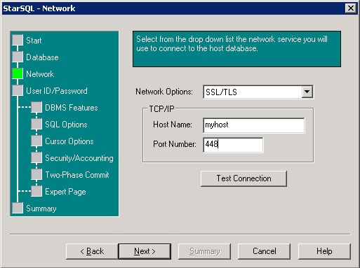 To create a StarSQL ODBC data source utilizing SSL, select SSL/TLS from the Network Options drop-down menu and enter the appropriate host SSL port on the Network panel. Use the Test Connection button to verify the connection is working.