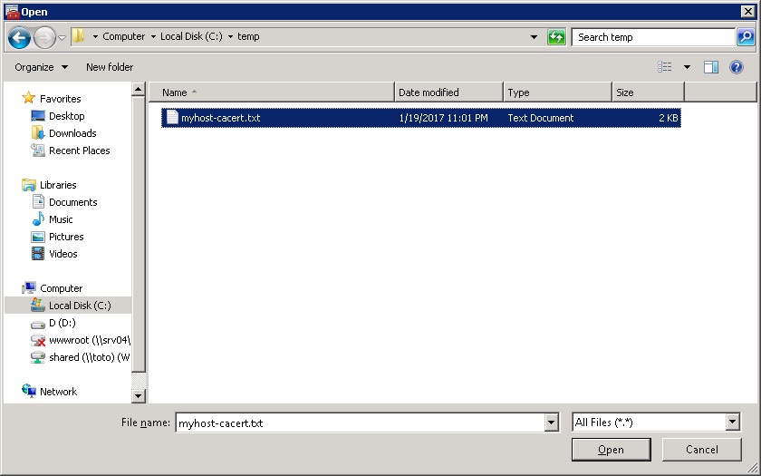 - This will start the Certificate Import Wizard. Click Next. On the File to Import screen, use the Browse button to identify the text file containing the CA certificate exported from the host. If the filename includes an extension other than one of one of the extensions expected by the MMC certificate plugin, select All Files.
