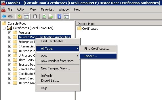 - Select Trusted Root Certificate Authorities, right click and select All Tasks/Import...