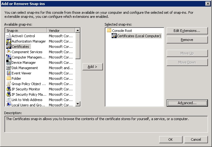 - Under Available snap-ins, double-click Certificates.